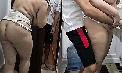 Stepmom is surprised by her sonnie and rams her big cock in the kitchen