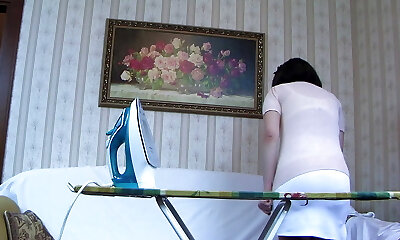 Nasty maid in beautiful lingerie set with pantyhose and garters fucks like nobody